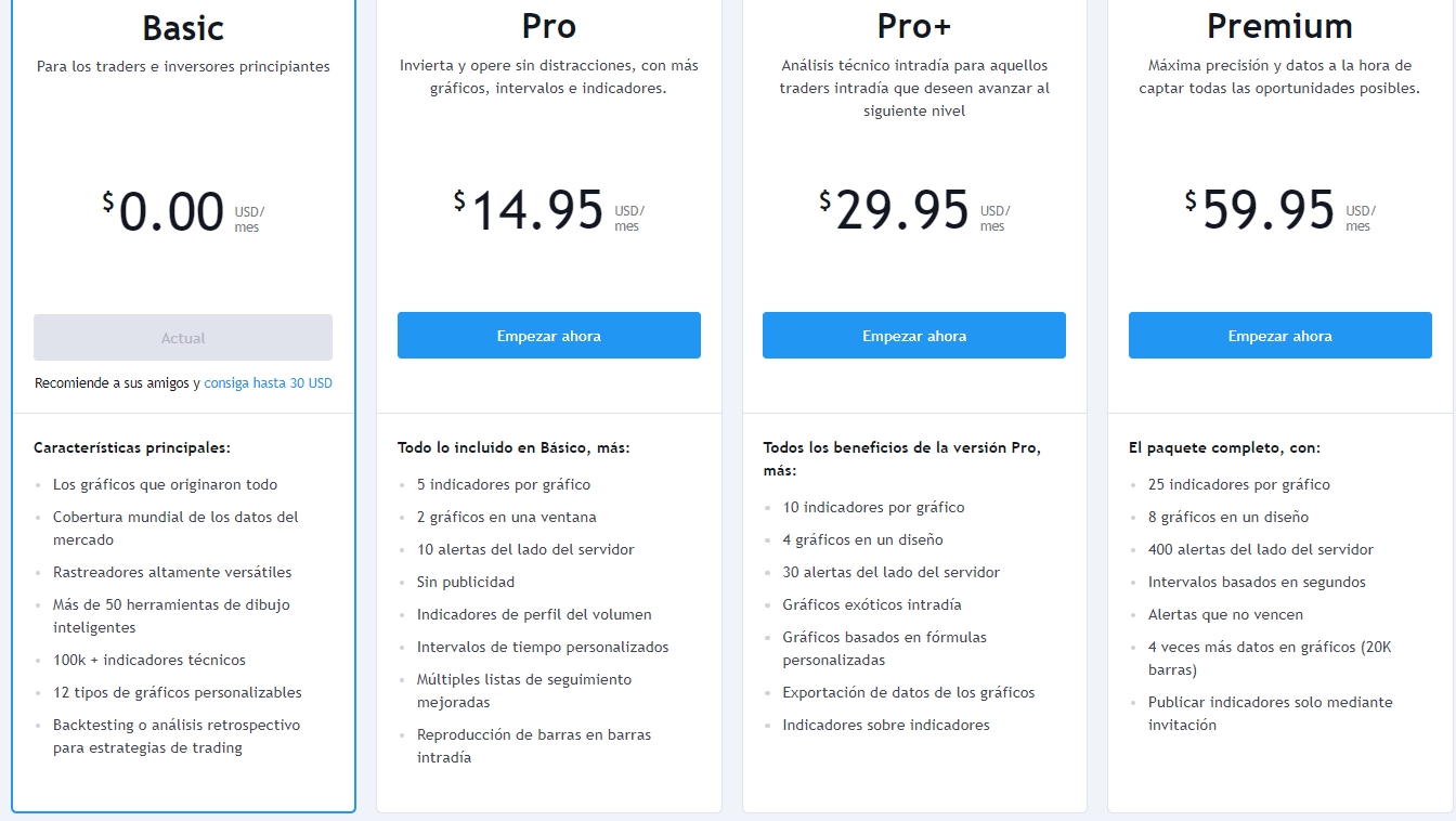 Las funcionalidades que ofrece TradingView en su plan Basic son suficientes para un trader principiante. No obstante, para otros operadores que tengan cierta profesionalidad, TradingView tiene una serie de planes que dan acceso a otra serie de funciones.