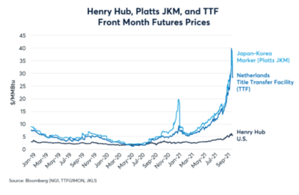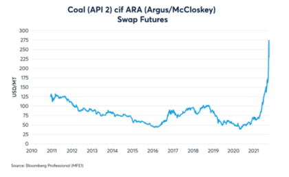 Actualmente, las curvas de futuros del carbón y del gas natural sugieren que el comercio anticipa que los precios del carbón y del gas natural euroasiático se mantendrán relativamente altos durante el otoño y el invierno de 2021 y 2022 antes de moderarse a niveles que todavía están significativamente por encima del 2020 y niveles del primer semestre de 2021 a mediados de 2022. Esto sugiere que, si bien algunos inversores pueden esperar que algunas de las presiones de costes más significativas disminuyan a mediados de 2022, la gran mayoría se está preparando para un invierno difícil. De ser así, el mundo podría experimentar un aumento significativo de la inflación durante los próximos seis meses combinados con interrupciones adicionales de la oferta cuyo impacto podría extenderse a los mercados financieros y de materias primas.