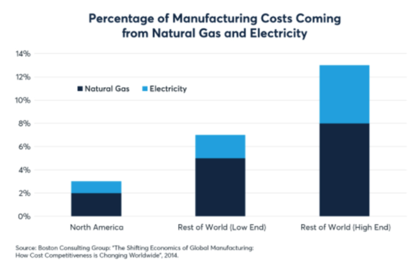 Los procesos manufactureros son intensivos en energía. La industria pesada se alimenta de un mix de carbón, gas natural, electricidad (gran parte de la cual se genera por carbón y gas natural), y petróleo, con una mínima aportación de las energías renovables. En décadas pasadas, las empresas manufactureras de EEUU y Canadá consolidaron importantes ventajas competitivas en torno a sus costes de producción gracias a un precio relativamente barato del gas natural en Norte América. Concretamente, para los norteamericanos, el coste de la energía solo representaba en 2014 un 2% del coste de producción (gas natural) y un 1% adicional (electricidad). En sus homólogas europeas o asiáticas esta cifra se eleva a 5-8% (gas natural) y un 2-5% por la electricidad.