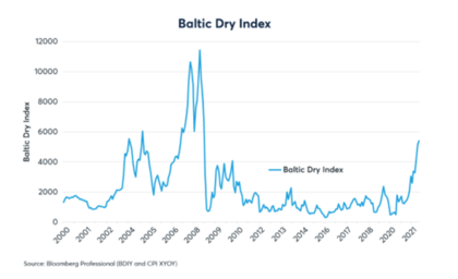 Antes de la última subida de los precios del gas natural y del carbón, las cadenas de aprovisionamiento ya estaban experimentando a nivel global severas tensiones. Aunque no es un indicador perfecto para medir las interrupciones en las líneas de suministro, el costo de envío, medido por el Baltic Dry Index, ha aumentado un 350% desde principios de año (Figura 5). La revolución de las entregas “just in time” comenzó en Japón en la década de 1980 y se extendió por todo el mundo en la década de 1990, reduciendo los costes de inventario y liberando capital circulante, lo que generó enormes ganancias en eficiencia y productividad.