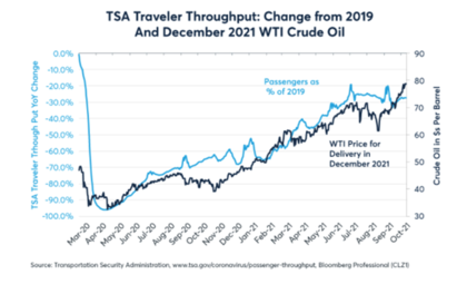 Desde el inicio de la pandemia, el precio del petróleo siguió de cerca la demanda mundial de viajes (Figura 6). Sin embargo, en medio del alza de los precios del carbón y del gas natural euroasiático, la demanda de petróleo crudo y de viajes ha comenzado a divergir. La recuperación en los viajes avanzó bien hasta finales de junio cuando la variante delta se extendió por todo el mundo. Al principio, los precios del petróleo reaccionaron negativamente a esta evolución. Sin embargo, desde mediados de agosto, el aumento de los precios del gas natural y el carbón, junto con la reducción de los inventarios y la negativa de la OPEP a aumentar la producción, han contribuido a un aumento de los precios incluso cuando la demanda de viajes sigue siendo baja.