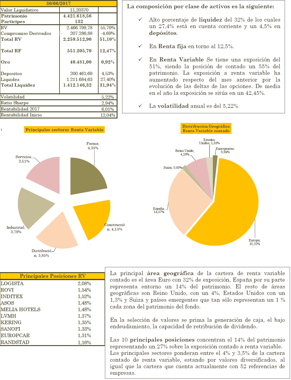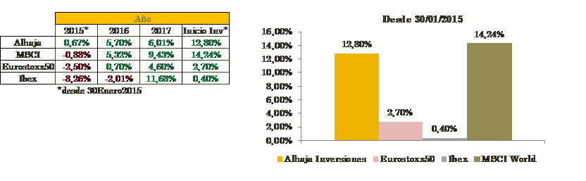 Alhaja cierra el mes de Junio con un retroceso de -1,03% y en lo que va de año suma una rentabilidad de +6,01%. Desde inicio de su registro el 9 de enero 2015 en CNMV con un valor liquidativo de 10€ cuenta con una revalorización de 12,04%.