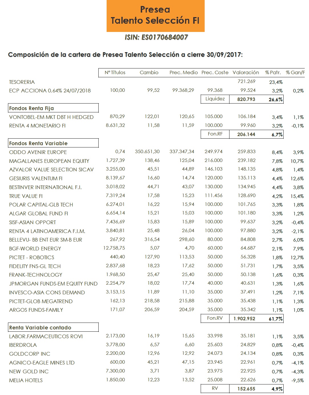 Se cierra un trimestre más de este 2017 con las vistas ya puestas en el turrón. En este mes Presea Talento se ha revalorizado un +1,64%, consiguiendo en el tercer trimestre del año una suma de +2,59%.