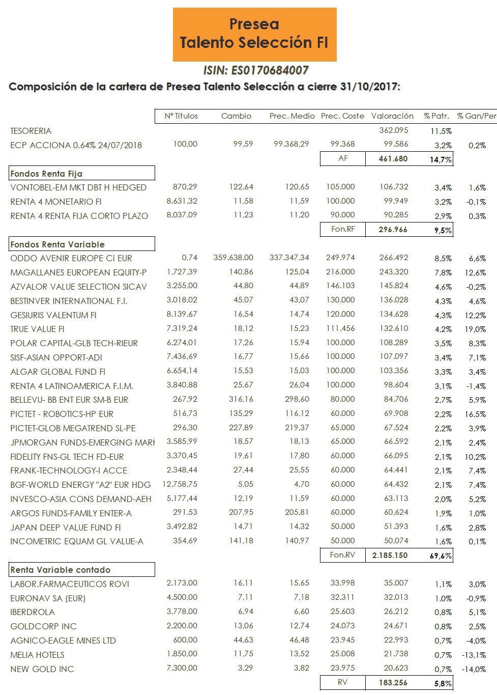 Presea se ha revalorizado un +1,11% en octubre, y desde su puesta en funcionamiento a finales de enero de este año alcanza una revalorización del 6,26%