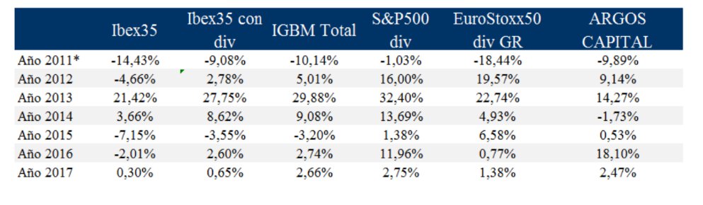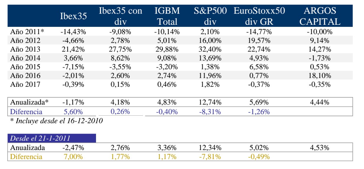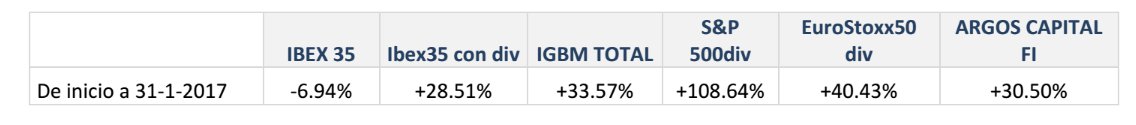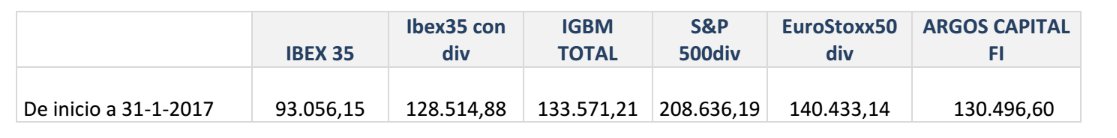 La siguiente tabla compara el valor liquidativo del Argos con los principales índices: