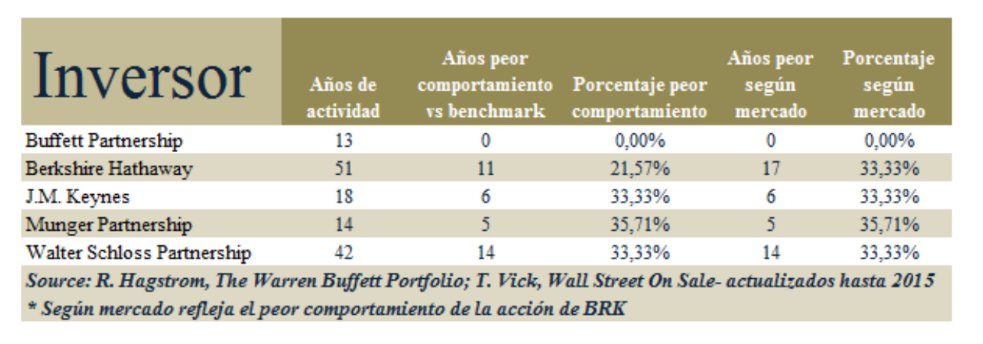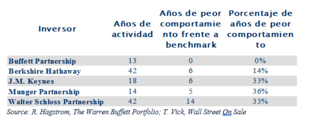 No, estos seis años, precisamente no han sido nada sencillos por lo que es posible que la comparativa- con todas las salvaguardas que queráis- pueda tener un punto de relevancia. Me hacía ilusión esta tabla de la evolución de los resultados frente al mercado de algunos de los mejores y más importantes inversores de la Historia; de todos ellos sólo Buffet a través de Berkshire Hathaway continúa en vigor, los demás al cerrar sus partnerships siguen apareciendo sin modificar la tabla original, pero en el caso de Warren Buffett (y con él Charlie Munger como socios) he modificado dicha tabla para incluir la comparativa de la evolución de la acción de Berkshire Hathaway frente al mercado y no sólo la evolución del valor en libros (que era el dato original de la tabla de Hagstrom).