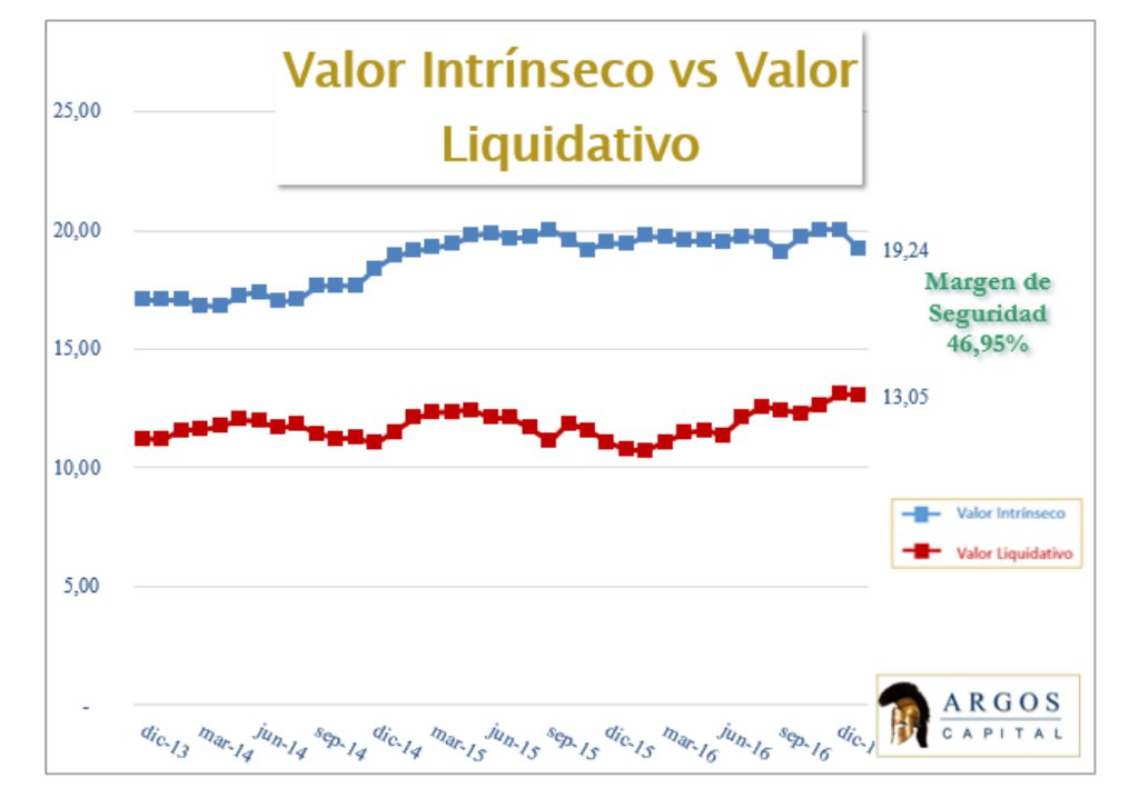 Como podéis observar en el gráfico final, el margen se ha disminuido ligeramente en este mes básicamente por el efecto del ajuste del valor de la operación de arbitraje comentada en la Carta a su estimación más prudente y por ello el valor liquidativo del Argos es equivalente a comprar un billete de cien euros por 68,05 €, lo que supone que el margen de seguridad de nuestra cartera sigue representando la posibilidad de adquirir los activos del Argos a un precio muy ventajoso.