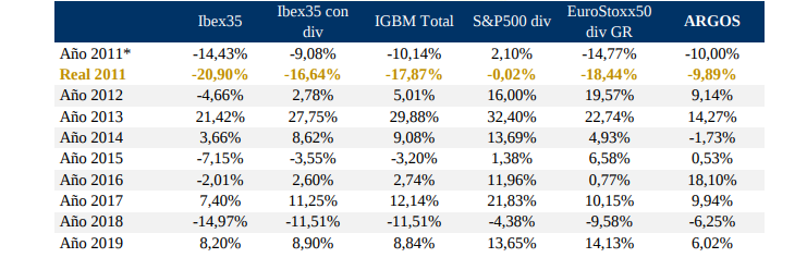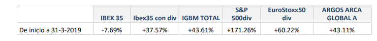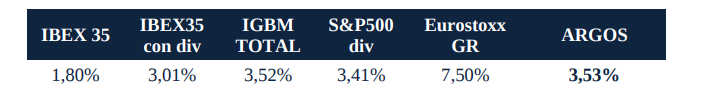 La siguiente tabla compara el valor liquidativo del Argos con los principales índices: