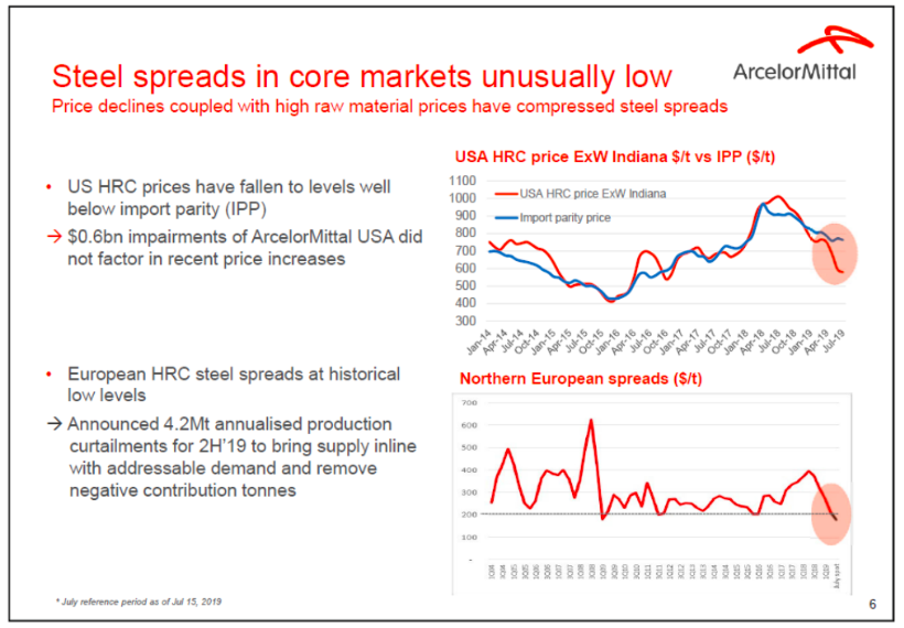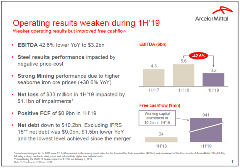 Actualmente la empresa al igual que el resto del sector lo está pasando relativamente mal porque está siendo una situación complicada. Eso no debería asustarle a nadie que se considere “inversor” porque es el pan de cada día. Si no es por unas cosas, será por otras, pero siempre pasa algo que hace que haya algo que no esté perfecto. Si lo fuera, cuidado. Esta situación actual de ArcelorMittal se ve condicionada, digamos, por dos lados principalmente: el precio de la materia prima y con él el exceso de capacidad que aún existe en el sector y, en segundo lugar, el peso que tiene el sector automovilístico y el propio declive de éste. Dicho en pocas palabras: ajuste. Por un lado, al haber aún exceso de capacidad los precios a los que les gustaría vender el acero no son los ideales y además, los costes de extracción han subido haciendo que los márgenes se estrechen. Y por otro lado, como el sector automóvil está también que da pena verle, pues para qué quieres más … ¿lloramos o nos damos abrazos compungidos? En cualquier caso, una tristeza.