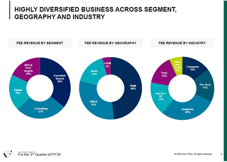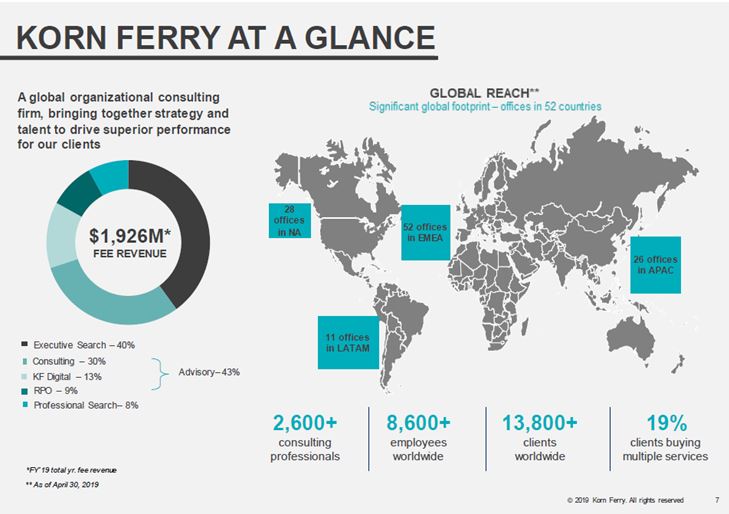Respecto a las dos nuevas incorporaciones a la cartera, la primera es KORN FERRY, empresa líder en el sector de organización, selección y reclutamiento de ejecutivos a nivel mundial. Fue fundada en 1969 y actualmente es una de las más reputadas de las Cinco Grandes (Korn Ferry, Spencer Stuart, Egon Zehnder, HSII y Russell Reynolds) y a lo largo de los años ha acompañado a muchos de los principales ejecutivos en puestos ascendentes a lo largo de sus carreras. Dentro de sus clientes recurrentes son el 98% de las empresas que forman el FORTUNE 100 o el 93% de las que forman el FTSE 100. De hecho el 90% de sus acuerdos en 2019 han sido con clientes ya existentes.