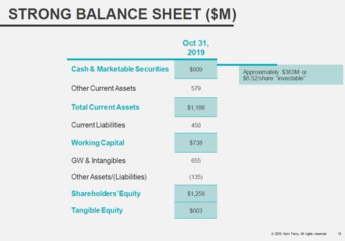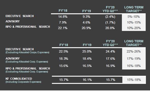 A lo largo de 2019 adquirieron tres de esas empresas de nicho de mercado: Miller Heiman Group, Strategy Execution y Achieve Forum lo que le ha servido para incrementar el peso tanto de la división KFDigital, como del segmento RPO (Recruitment Process Outsourcing); para ambos segmentos se esperan fuertes crecimientos en el futuro y mayores márgenes que en la línea de negocio tradicional.