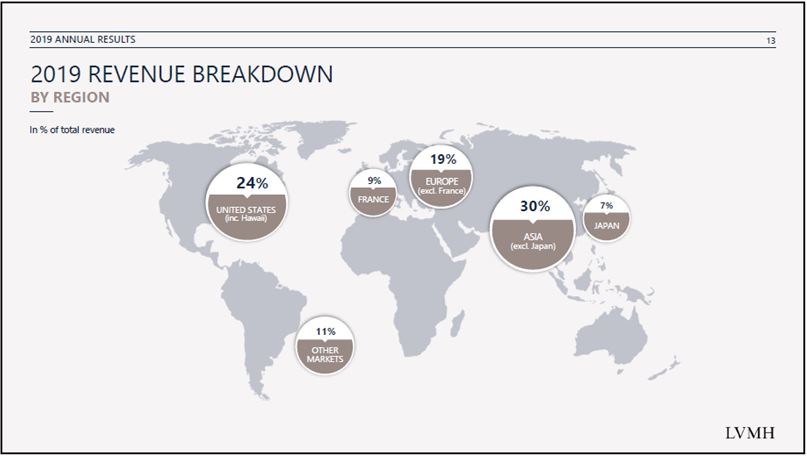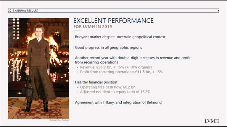 Como podéis apreciar, el año pasado fue un buen año para ellos- y no será el único, aunque no creo que podamos contar el 2020 en este sentido- buen crecimiento en todas sus áreas geográficas a nivel mundial, solidez financiera- casi no tiene nada de deuda- y como broche al año, acuerdo de compra de la joyería más famosa del mundo Tiffany e integración de otra casa, Belmond, en este caso una cadena de hoteles de lujo, que al igual que el resto de la economía se ve afectada en estos momentos, desde luego con mayor fuerza que otros sectores. Pero ambas casas son auténticas joyas en sus sectores, con activos irrepetibles y con una impronta en el consumidor. Un par de estupendas operaciones… en un momento de incertidumbre. Ahora LVMH está más ocupada en ayudar a luchar contra el COVID-19 mediante sus laboratorios fabricando gel desinfectante. Tiempo vendrá en el que recuperará la senda normal de operativa de negocio.