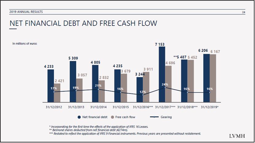 Ahí podemos ver que LVMH es muy rentable… y lo seguirá siendo en el largo plazo. Dado que la Carta se está alargando, tan sólo os incluyo una nueva gráfica más, la relativa a la evolución de su deuda neta y la generación de efectivo: