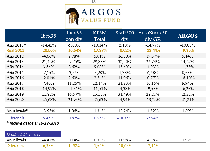 La siguiente tabla compara el valor liquidativo del Argos con los principales índices: