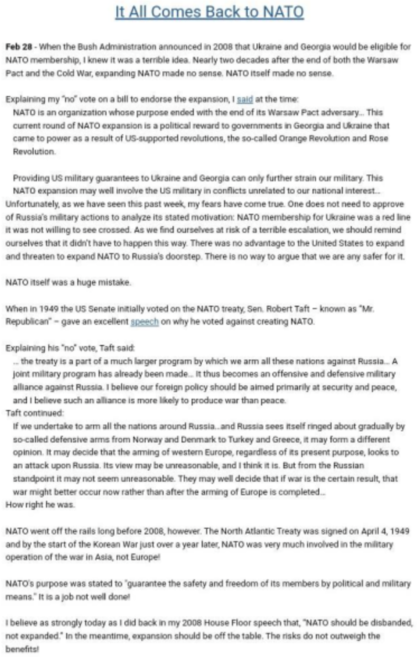 Os paso unas reflexiones de Ron Paul, liberal y ex senador del partido Republicano, reconocido por su independencia y su honradez durante varias décadas en defensa de la paz y la libertad y en contra de la expansión militarista de su país allende sus fronteras… aunque está en inglés, creo que os merece la pena tomarlo en consideración.