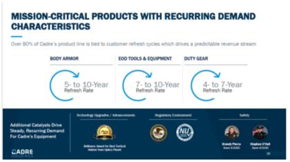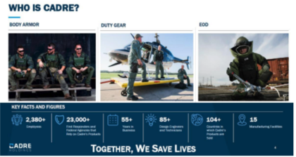 La historia de CADRE que se remonta a hace 55 años ha sido un ir y venir en la historia de Kanders; en su día formó parte de ARMOR Holdings, donde Kanders logró convertirla en una 100-bagger (la hizo crecer cien veces) y que fue adquirida por BAE Systems, pero Kanders pudo hacerse con un la filial de Armor: Safariland… esto es ahora CADRE HOLDINGS. Y nuestra empresa se dedica, básicamente, a ofrecer productos de alta calidad para los cuerpos y fuerzas de seguridad del estado de hecho, alguno de vosotros que sois policías, me habéis comentado que los productos son de alta calidad y que tenéis alguno de ellos. Estos productos, para haceros una idea van desde chalecos y petos antibalas, cartucheras y cinturones para el arma reglamentaria, sistemas de comunicación, esposas o sistemas de protección anti explosivos, por ejemplo. Una de las curiosidades que conforman su cultura de empresa es que, cuando algún agente ha salvado la vida gracias a sus sistemas, paran las plantas y realizan un pequeño homenaje para recordar todos los empleados que su trabajo salva vidas de verdad.