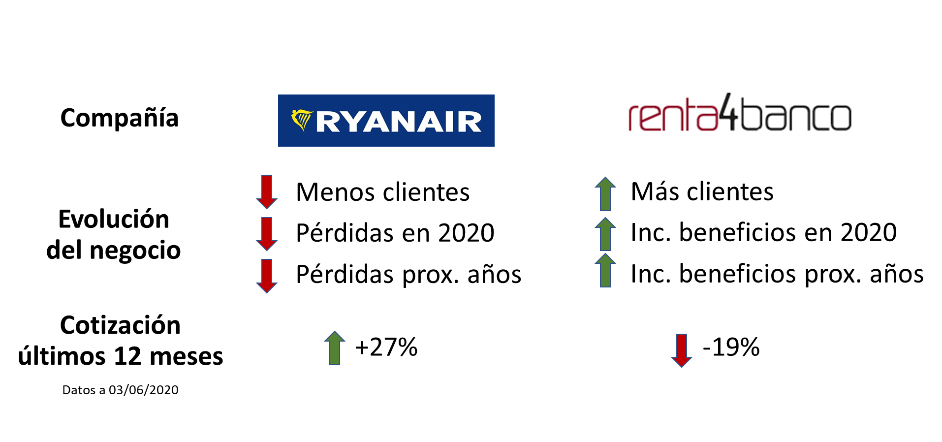 A pesar de estos motivos, como se puede ver en el esquema anterior, las cotizaciones de Ryanair y Renta 4 banco han tenido un comportamiento muy diferente al de sus negocios. Esta situación es bastante común actualmente en los mercados financieros y por ello se están generando mayores oportunidades de inversión.