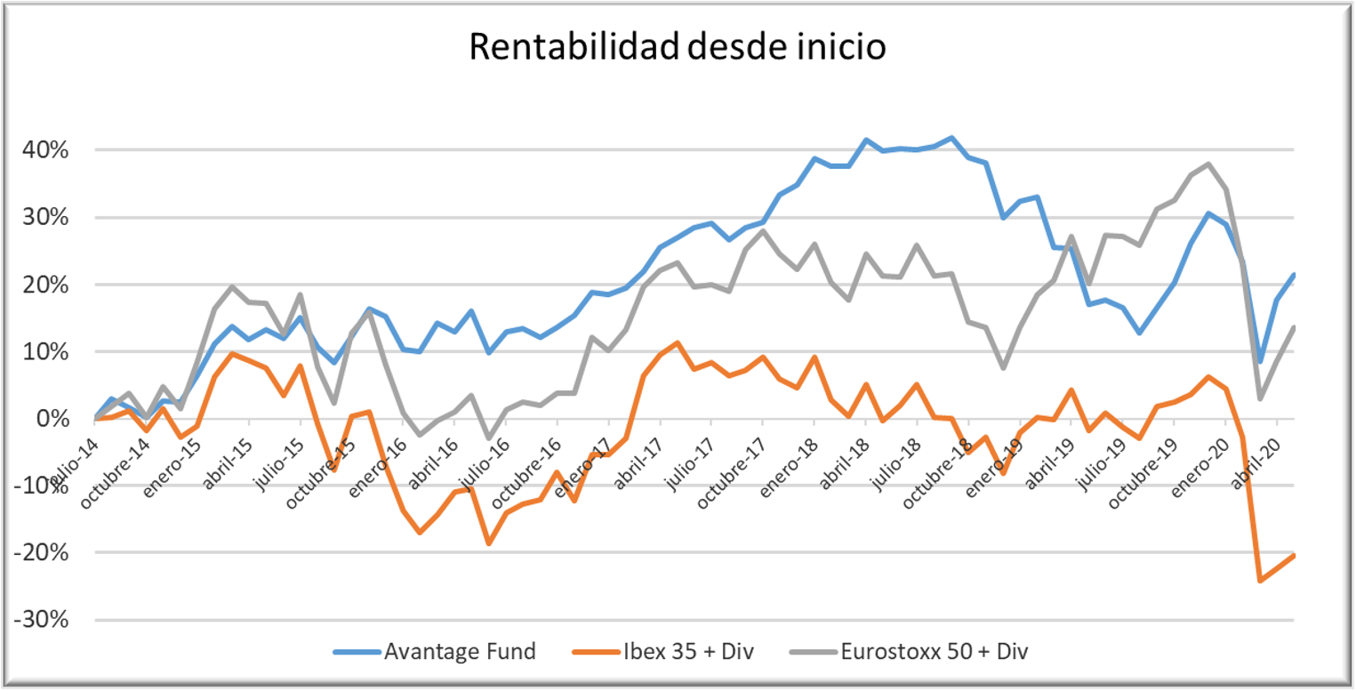 Rentabilidad desde la constitución del fondo (31/07/14) comparada con el Ibex 35 y el Eurostoxx 50 incluyendo dividendos. Hasta el 29 de mayo de 2020.