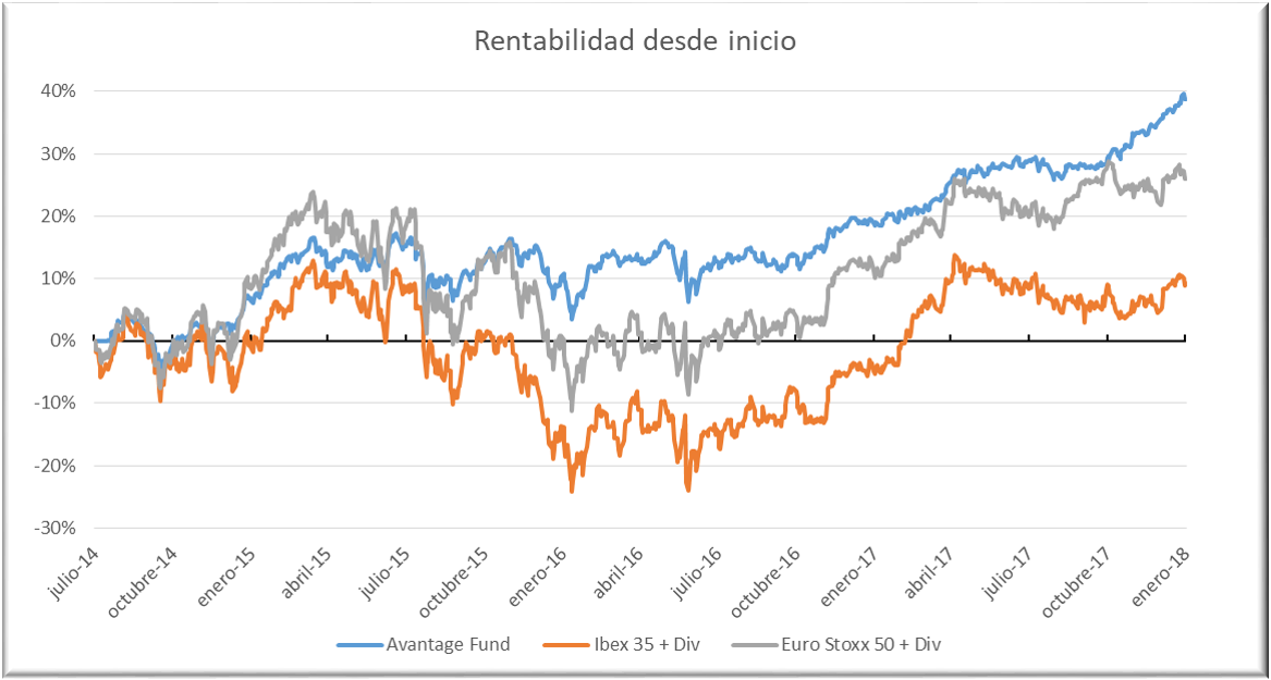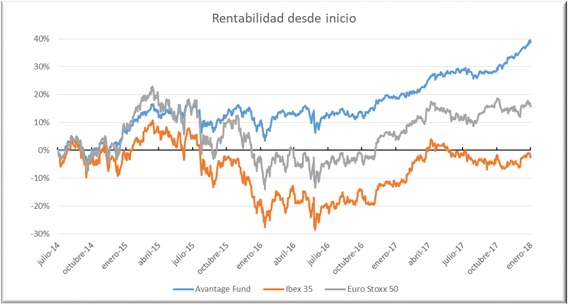 Rentabilidad hasta 31/01/18 desde la constitución del fondo (31/07/14) comparada con el Ibex 35 y el Eurostoxx 50