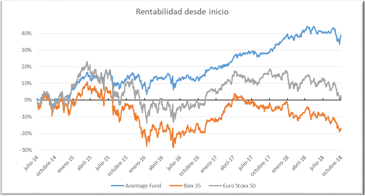 Rentabilidad de Avantage Fund desde la constitución (31/07/14) comparada con el Ibex 35 y el Eurostoxx 50