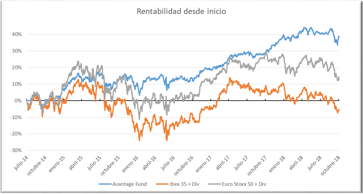 En octubre se han producido fuertes descensos en las bolsas a nivel global. Este mes la rentabilidad del fondo ha descendido un 2,0% frente a un rendimiento del -5,3% y del -5,9% del Ibex 35 y del Euro Stoxx 50 respectivamente. En los diez primeros meses de 2018 Avantage Fund acumula una rentabilidad positiva del 3%. La evolución del fondo ha mejorado significativamente cuando se han empezado a publicar los resultados empresariales del tercer trimestre de 2018. Ya podéis consultar la ficha a 31 de octubre.