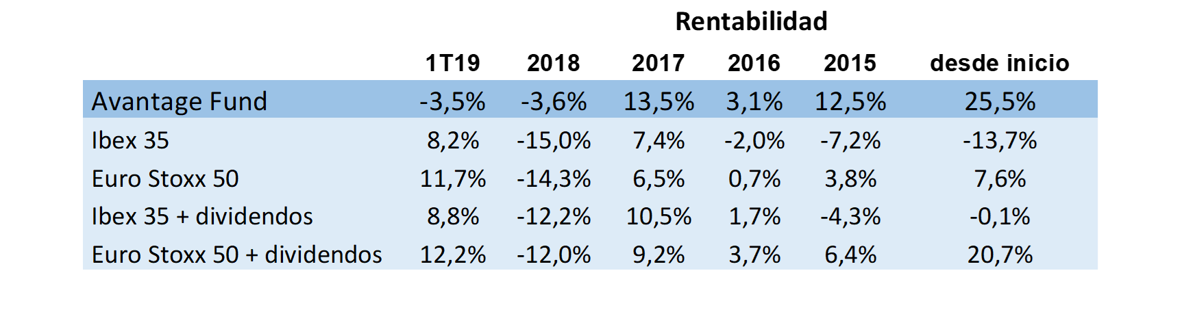 En el primer trimestre de 2019 los principales índices bursátiles han recuperado gran parte de lo perdido durante 2018. Sin embargo, Avantage Fund no ha tenido el mismo comportamiento. En esta carta quiero explicar los motivos de la evolución reciente del fondo, la estructura de la cartera actual y algunas de las razones por las que confiamos en las principales inversiones.