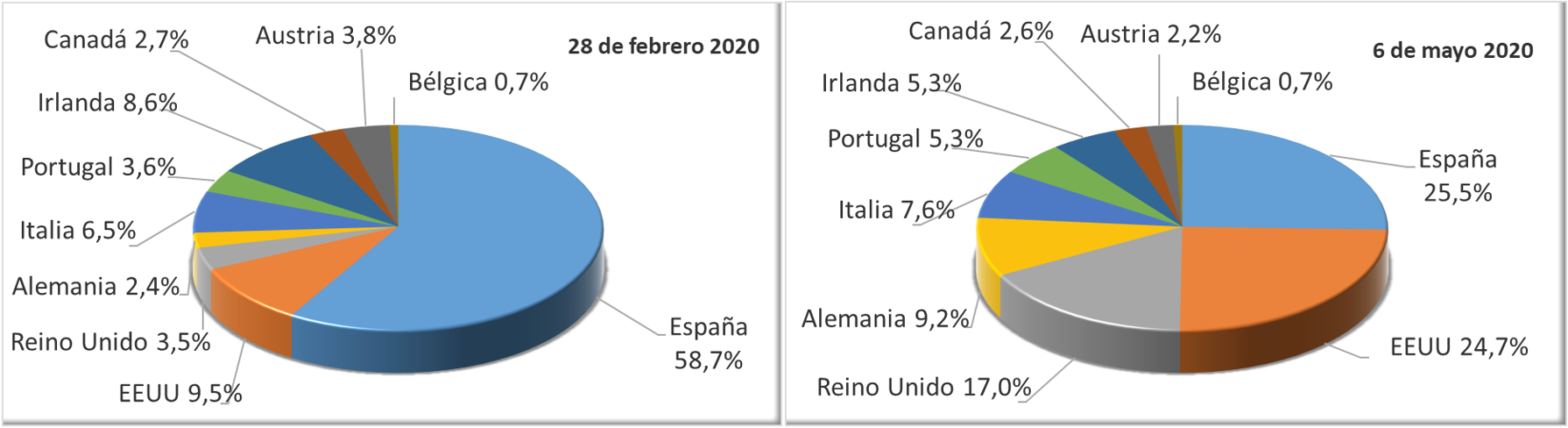 En los siguientes gráficos se muestra el peso de la renta variable por país a 28 de febrero y a 6 de mayo. Se puede ver cómo la exposición neta a la renta variable española se ha recudido muy significativamente en este tiempo.