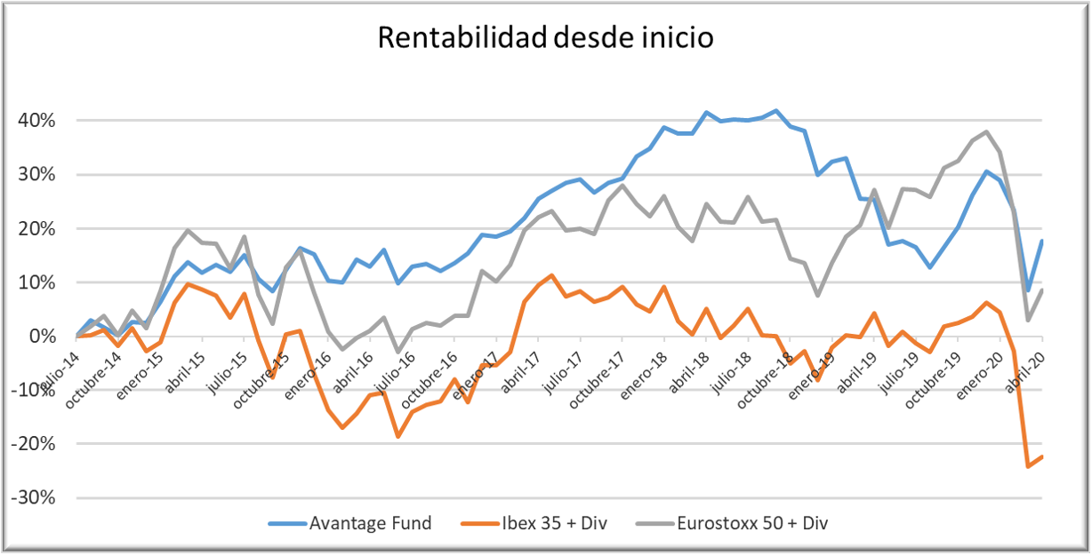 Rentabilidad desde la constitución del fondo (31/07/14) comparada con el Ibex 35 y el Eurostoxx 50 incluyendo dividendos. Hasta el 30 de abril de 2020