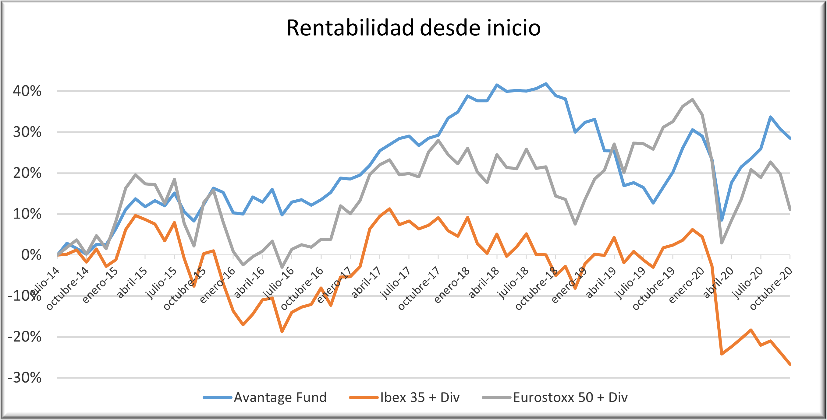 Rentabilidad desde la constitución del fondo (31/07/14) comparada con el Ibex 35 y el Eurostoxx 50 incluyendo dividendos. Hasta el 30 de octubre de 2020