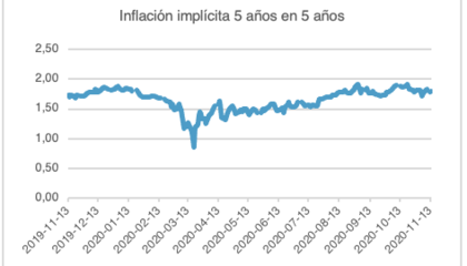 Para la evaluación posterior del mercado es esencial saber si un posible programa de estímulo elevado de los demócratas aumentará las expectativas de inflación y, por lo tanto, elevará los tipos de interés. La mejor estimación de las expectativas de inflación del mercado para los EE.UU. se obtiene de la inflación implícita de 5 años en 5 años.