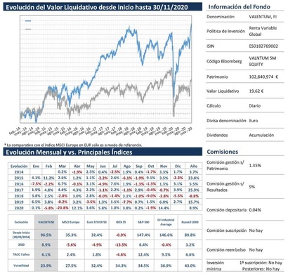 Durante el mes de noviembre, VALENTUM subió +14,40% (Eurostoxx +18,09%, IBEX +25,31%, MSCI Europe NR +13,95%, S&P500 en EUR +7,98%, Russell 2000 en EUR +15,29%).
