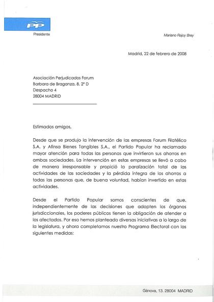 El PP, a través de sus portavoces y varios ex-Ministros del anterior Gobierno, desde el día siguiente a lde estas empresas declararon abiertamente que se trataba de un claro caso de Responsabilidad Patrimonial del Estado, y por ello, hasta en tres ocasiones en los años 2007, 2008 y 2009 presentaron tres Proposiciones no de Ley , sucesivamente, en el Congreso,para la creación de un FONDO DE COMPENSACION QUE CUBRIESE LA TATALIDAD DEL DINERO INVERTIDO POR LOS AFECTADOS DE FORUM Y aFINSA Y ARTE Y NATURALEZA. La última de esas tres Propuestas Parlamentarias, se votó en la Comisión de Economía y Hacienda con el resultado de 20 votos a favor y 20 en contra (Psoe y CC), por lo que el triple empate de la votación hubo de dirimirse recurriendo al "voto de calidad " del Presidente de esa Comisión Antonio Gutiérrez (Diputado del Psoe y ex-Secretsario General de CC.OO).