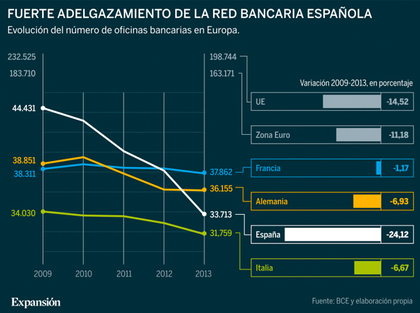 Buenas a todos. Lo dicho: España ha pasado a ser el tercer país de la zona euro con mayor número de oficinas bancarias por detrás de Francia y Alemania. Quizá esta realidad sea la más ajustada para España por tamaño y población. Es llamativa la diferencia de más de 10.000 oficinas de más respecto a Italia en 2009 a las 2000 oficinas de más en el pasado 2013. El ajuste en España ha sido brutal. La nueva banca de hoy día quizá invite a esta reducción pues mucha gente apenas necesita hacer uso de estas oficinas. ¿Qué os parece el dato? Os dejo enlace: http://www.expansion.com/2014/09/02/empresas/banca/1409654279.html