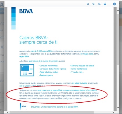 Si alguna vez necesitas sacar dinero con tu tarjeta BBVA en cajeros de entidad distinta a Grupo BBVA, ten en cuenta que según el reciente Real Decreto Ley 11/2015, sólo te aplicaremos la misma comisión que dicha entidad cobre a BBVA. Si sacas dinero con cargo al límite de crédito de tu tarjeta, además te cobraremos la comisión por retiradas a crédito en BBVA que figura en tu contrato.