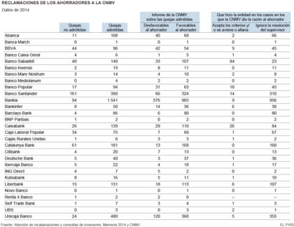 La memoria de la CNMV también establece una clasificación de las entidades que más quejas reciben y cuáles son las que disponen de más cintura a la hora de asumir culpas. Bankia fue el banco que más informes motivados tuvo por parte del supervisor (1.490), seguido por Unicaja (462), Banco Santander (323) y Catalunya Banc (172). Por su parte, los clientes de Barclays fueron a los que más dio la razón el organismo (en el 93% de los casos), seguidos por los de Catalunya Banc (92,8%), Deutsche Bank (92,5%) y Caja Laboral (90%).