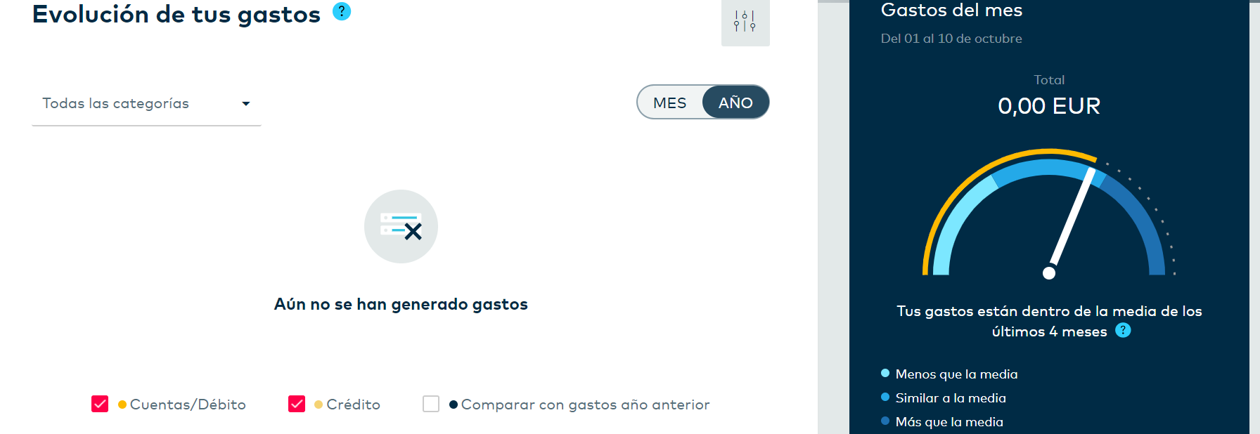 Llevo usando OpenBank desde enero y tengo una duda, no se si será algo que solo me pasa a mi pero... A pesar de que tengo decenas de recibos domiciliados, que pago la hipoteca todos los meses, que uso su tarjeta para pagar... en los gastos siempre me aparece 0,0€ y el mensaje de que aún no se han generado gastos. No soy capaz de ver desgloses por categoría ni nada. Os pasa a alguien más?