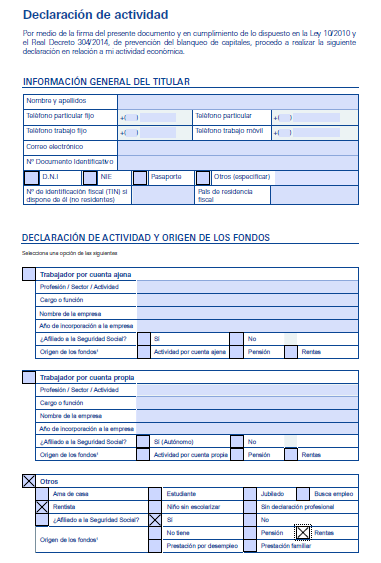 El banco dice que quiere más datos y remite un impreso a rellenar  que es una declaración de la actividad del titular de la cuenta corriente.