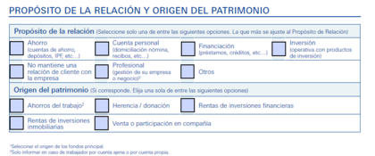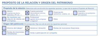 Ya en la segunda parte del impreso pregunta otras cosas que me gustaría conocer porque no se explican en el impreso . Tienen que ver con el propósito de la relación y orígen del patrimonio. Yo estoy interpretando que se refiere a la relación del titular con el banco a través de la cuenta. Caso contrario que alguien me corrija.