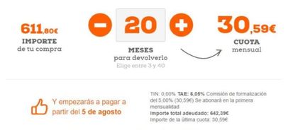 Como bien ven en la foto pone que tienen un TIN del 0.00% pero un TAE de 6.05% y una cuota de formalización del 5.00% que debo abonar el primer mes con30.59 euros.