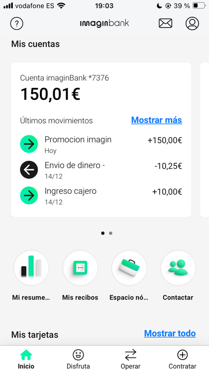 Promoción imagin ya recibida , me ha entrado hace unos minutos No hagáis mucho caso cuando os salgan nuevas actualizaciones , siempre cambian , a mi ayer me salía que necesitaban otra nómina para hacerme el ingreso del incentivo y hoy eso ya no me salía Recibí 150€ y no 250€ por que es probable que no tenga todos los meses 1500€ para hacer un tinto ya que cobro yo siempre 1.100€ de media asi que no quise arriesgar😅❤️ Gracias a todos por vuestra labor y espero que hoy la hayáis recibido los que la esperáis tanto de Imagin como de otro banco Saludos!