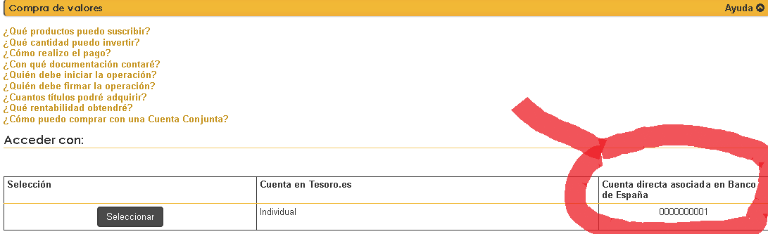 - 2ª: La "cuenta directa asociada individual o conjunta" del Banco de España es una nueva cuenta que nos abren automáticamente al comprar Deuda. Es de valores, sin IBAN, no puede tener efectivo, sólo tiene 10 dígitos, es la que custodia los títulos de Deuda, debe tener los mismos titulares que la cuenta de abono y sólo se puede abrir si va ligada a una suscripción o compra de Deuda. Un titular puede serlo de cuenta individual y varias cuentas conjuntas. No puede haber cuentas conjuntas con exactamente los mismos titulares.