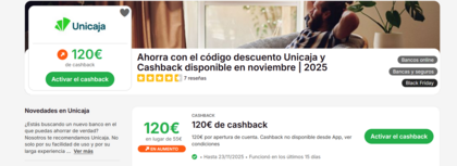 Como adelanté, hoy se cumplen cashback de Igraal de 120€ en Unicaja. Sería contratación de la requetecuenta 3% pero @ravel nos descubrió cómo hacerlo si queréis contratar la cuenta RM con la que luego podemos adherirnos a la promoción de haberes. Faltaría confirmar que pagarían el cashback pero a él ya le apareció pendiente en Igraal (contratando la requetecuenta 3% no habría problema).