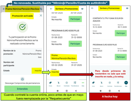 No sé si tienen mal la App, y la Web, o las van a dejar como están ahora, pues entrando por "S0rte0s y Pr0m0ci0nes" ahora no me sale (como a muchos más) que esté inscrito a lo que antes figuraba inscrito. Vale, han cambiado la pr0m0: antes eran 630 € (450 + 180 recibos) y ahora solo los 450 pero, aunque mi promo no esté vigente hoy, debería salir que sigo inscrito a la que me inscribí correctamente en su día. Cumplir ya han cumplido con los 450 y también -hasta ahora- con los 15€ por recibo mensual. Imagino que seguirán cumpliendo, pero nada me gusta que haya desaparecido a lo que estaba/estábamos inscrito/s. El incentivo 15€ por recibo domiciliado el mes pasado tendrán que pagarlo como muy tarde el próximo martes 11-nov (en los primeros 7 días hábiles de cada mes). Esperemos que lo sigan haciendo...