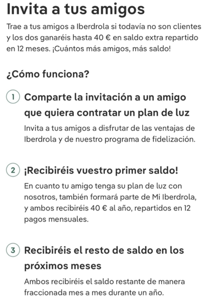 Son dos planes amigos o de referidos, cuando das el DNI de tu amigo te pregunta si te quieres unir al plan amigo de mi iberdrola para compartir un enlace que sacas de la app, pero que no tiene nada que ver con el otro plan amigo, son compatibles entre si, pero con igraal solo es compatible el del DNI. El de los 50 € insisto (que normalmente es de 25€) se descuenta en la primera factura y tiene un limite de 10 amigos al año, después se resetea a 0. Hilo de referidos de Iberdrola desconozco si hay la verdad, yo ni siquiera estoy en esta compañía, estoy en octopus, así que de autopromoción me parece que tiene poco, sólamente quería completar la información.