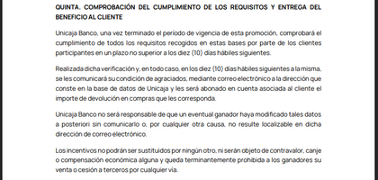 Unicaja Banco, una vez terminado el período de vigencia de esta promoción, comprobará el cumplimiento de todos los requisitos recogidos en estas bases por parte de los clientes participantes en un plazo no superior a los diez (10) días hábiles siguientes.