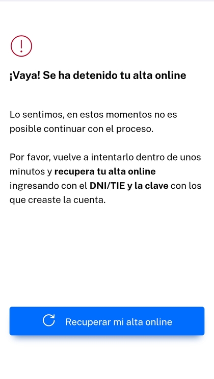 Me pasó lo mismo y en el mismo punto (más de 10 intentos, supongo que por eso al final me falló el alta desde igraal). Solución, puse otro número de teléfono y pude continuar.