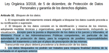 No obstante, mi intención -en principio- no es apresurarme a cerrar para reabrir cuanto antes. El día que cancele, que no lo tengo decidido, solicitaré ejercer mi derecho a la supresión (en realidad ya sabemos que es un bloqueo, no una supresión en sentido estricto) de mis datos personales, para que no puedan acogerse a eso de que "usted ya se benefició en el pasado de una promo n0.m1n@" pues si argumentaran eso sería prueba irrefutable que habrían accedido a los datos bloqueados cuyo acceso (desbloqueo) estaría permitido exclusivamente al poder judicial y a las instituciones expresamente citadas en el Artículo 32 de la LOPDGDD: Por otro lado, como también tenemos cashback 3% por recibos de luz y gas, y tengo uno de esos suministros domiciliado con ellos, el de mayor importe mensual, que abonan en cuenta los días 15 del mes siguiente al último trimestre natural vencido, no quisiera desperdiciar, por una cuestión de prisas, que el 15-ene-26 me reintegren el 3% de los recibos domiciliados en oct-nov-dic (último trimestre natural del año 25).
