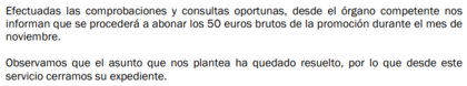 Con respecto a tu CB (cashback) pendiente por la promo te la TC Oro, a ver si tienes suerte y te pagan antes de tener que ponerte a reclamar. En mi caso tuve que reclamar oficialmente ante el SAC oficial, pues no me pagaban y después de 3 semanas (15 hábiles) recibí carta por email con resolución favorable a mi reclamación. En estos términos: Pero desde que recibí esta resolución ya han pasado unos días y todavía nadie ha pulsado el botón para ingresarme los 50 €/brutos. Eso sí, noviembre no ha acabado, cierto, pero se ve que mucha mucha prisa no tienen. Les queda medio mes, tic-tac, tic-tac. Quiero pensar que abonarán en el plazo comprometido. Suerte con lo tuyo.