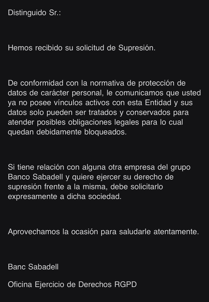 Cancelación de cuenta y tarjeta por teléfono, a los 2 días ya no me dejaba acceder, y la supresión por email, siguiendo el proceso tal y como han descrito algunos compañeros, a los 3 días me respondieron con ese email. Ambas cosas las hice una detrás de otra el mismo día.