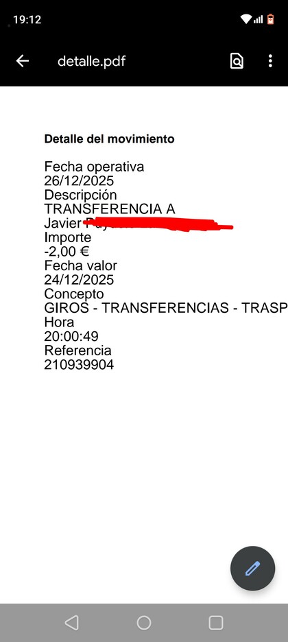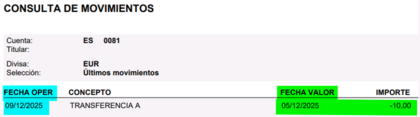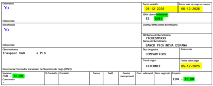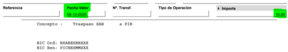 Ejemplo, también con otra inmediata de salida desde el S4b4 ordenada el viernes 05-dic hacia PIB. En el justificante no sale que le han asignado fecha operación martes 09-dic (el lunes 08-dic fue inhábil por festivo nacional), pues no existe el campo "Fecha operación" en dicho justificante: Pero, en el listado de movimientos, descargado a pdf, que será 100% fiel al extracto que no puedo descargar hasta que finalice el mes de dic-25, sale que le asignaron fecha operación el martes 09-dic, es decir, el día hábil siguiente al viernes 05-dic: En PIB entró, lógicamente, en fecha valor 05-dic: Total, que esos mismos 10€ estuvieron remunerados en ambas cuentas los días 5, 6, 7 y 8.
